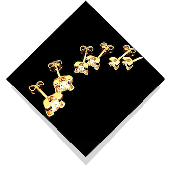 På billedet ses guldstikker med de mindste sten, en mellemstørrelse og et par med store diamanter, i alt 0,30 ct.