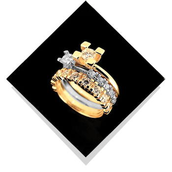 Her ser du både Allianz i guld med mange diamanter, ved siden af den særlige model, en garder allianceringe i hvidguld, med både stor diamant og mindre diamanter - den giver plads til anden ring, f.eks. Brillanz. Øverst en stor Allianz ring i guld.
