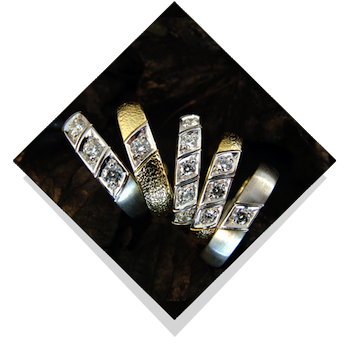 Og så er der vist to ringe i 5,0 mm, en hamret guld med 1 0,10 ct. diamant i hvidguldsfatning, og en matteret hvidguldsring med 3 diamanter ialt 0,30 ct.