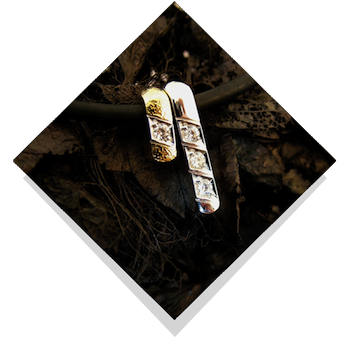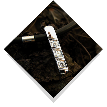 Alliancehalssmykker på kautjukkæde (gummiart), det lille smykke med 1 diamant, i hamret guld med hvidguldsfatning rundt om brillanten, eller den længere version, hvor der er 3 diamanter i blankt hvidguld.