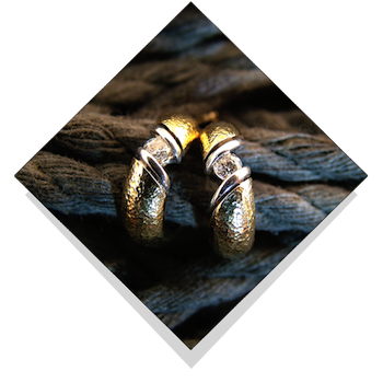 Her ser du et par øresmykker, formfulde creoler i 14 karat guld med hvidguldsbånd, de fås i en smal version med 2 stk. 0,04 ct. brillanter eller i denne noget bredere model med 2 stk. 0,14 ct. brillanter. |