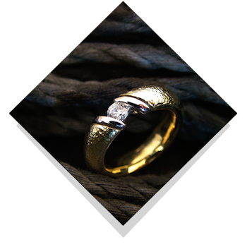 United Romance ring. Her ser du den bredeste af ringen, i den runde form, men faktisk kan du også vælge at få ringe i en firkantet form, som vi kalder "quatro", denne form er ergonomisk korrekt og har en super god pasform, for faktisk er vores fingre ikke runde, men mere kantede. Jan Jørgensen har valgt at tilbyde både den runde og den firkantede form, så der er noget for enhver smag. Det kræver mere håndærksmæssigt arbejde at lave ringe firkantede så der er et mindre tillæg på prisen hvis du vælger quatro-formen. Ringen på billedet er med en 0,24 ct. brillant og den er i hamret guld med hvidguldsfatning. |