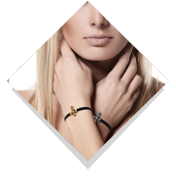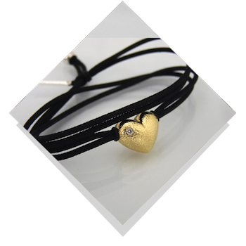 Armbånd i læder eller holdbar faldskærmssnor. Her er vist et  kors i sølv og 14 kt. guld med brillant i en af kuglerne. Armbånddsmykkerne er forskellige, de kan bl.a. også være kugler i 2 størrelser eller hjerter i sølv eller 14 karat guld/ hvidguld.