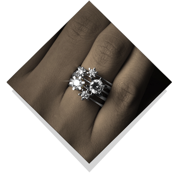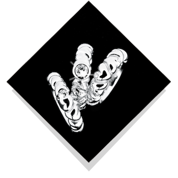 Hvidguldsdesign med hjerter og brillanter. Den bredeste og med den største diamant er 2Minds, 2Souls har en diamant midt i et af hjerterne, og 2Spirits har en brillant mellem hjerterne.  |