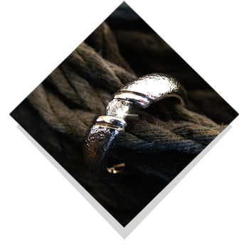 En populær ring, lækker blød, fyldig og markant. Virkelig et smykke der lægges mærke til med de fine bånd omkring diamanten, hamret og blankt 14 karat hvidguld i bedste kvalitet og stil.  |