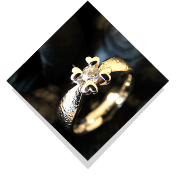 Her en stor og bred Royal Heart ring i hamret 14 karat hvidguld med blanke hvidguldshjerter ved brillanten. Formen er quatro, dvs. firkantet der sikrer at diamanten bliver siddende i toppen af ringen.  |