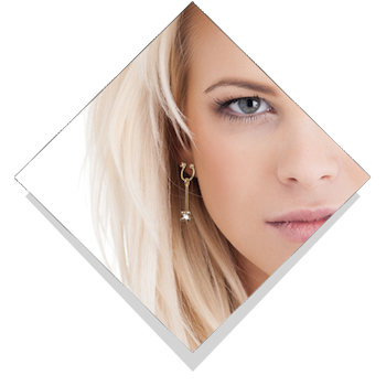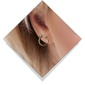 Her kan du se den lille "creol" på øret. Diamanten sidder på øreflippen og pynter i den ene ende og kuglen i den anden ende. |
