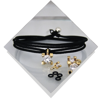 Her ses vedhænget i flere diamantstørrelser og det er også velegnet til armbånd, hvor det enkelt sættes på og holdes på plads af små gummi-dutter. |
