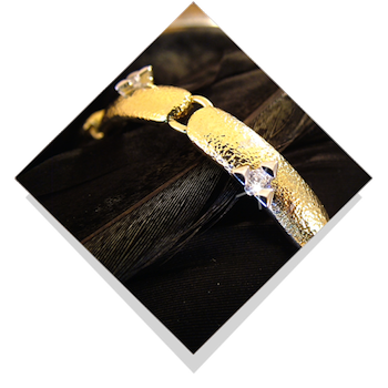|  | Guld/hvidgulds armbånd Royal Art Royal Art armbånd, bevægeligt armbånd der fås i fem bredder og med fem forskellige diamantstørrelser. Her blanke hvidguldsfatninger midt i det hamrede guld. |