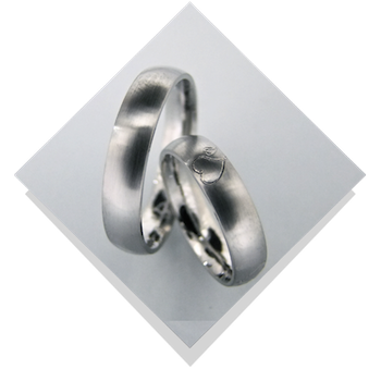 Blanke ædelstålringe med hjertesymbolet i dameringen. Også brillant i hjerte i dameringen. Herreringen helt enkel uden markeringer i overfladen. |