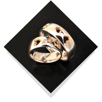 Disse kraftige og brede forlovelses- eller vielsesringe er i 925 sterlings sølv, og inde i hjerterne er der lagt 24 karat guld - for at give en smuk kontrast. I dameringen er der isat brillant.