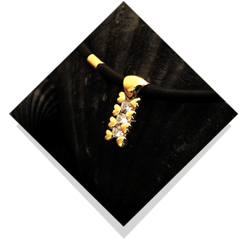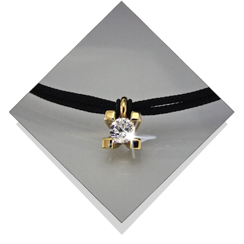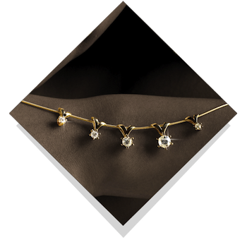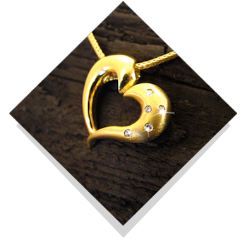 Her et halssmykke med hjerter som holder diamanten. 14 karat guld og mange diamantstørrelser fås, også ring og ørestikker der matcher kan du få i serien. |