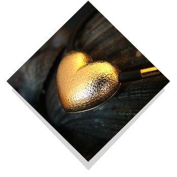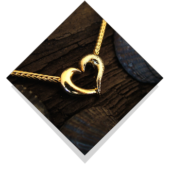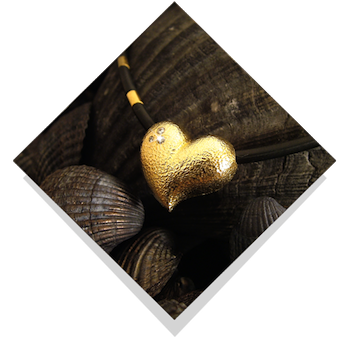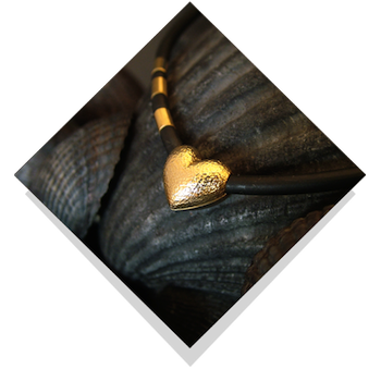 Her et kraftigt og klassisk hjerte i hamret 14 karat guld på kautjukkæde (en art gummi) hvor der sidder en guldeffekt i siden. |
