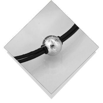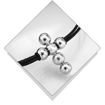Hamret hvidguldskors i 14 karat på stærk faldskærmsline. Du kan flytte på kuglerne så det ikke længere er et kors medn en pind og to kugler.