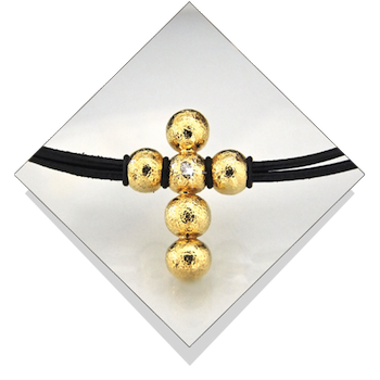 Et anderledes kors bestående af guldkugler. 14 karat hamret guld og en diamant i den midterste del.