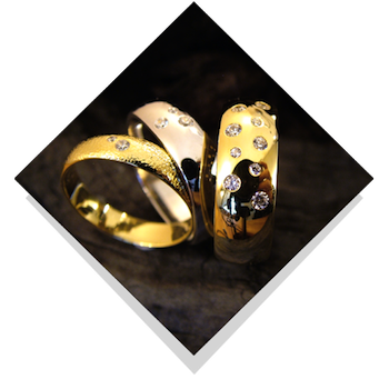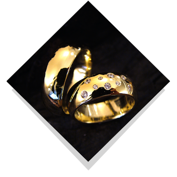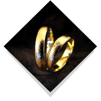 Disse vielsesringe fra Jan Jørgensen er kraftige og indeholder meget guld. Deres form og design har således megen volumen. Diamanten i dameringen går fra 0,05 ct. til en stor kvart carat, nemlig 0,25 ct. Bredden på ringen vokser i takt med at brillanten vokser, et fyldigt design i enkel stil.