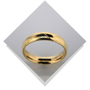 14 karat guldringe, med hamret overflade og den firkantede quatro-form. Den er ergonomisk behagelig at have på, og drejer ikke rundt på fingeren.