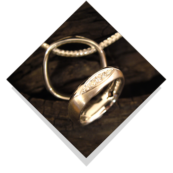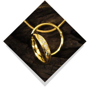 Her er ringene vist med herreringen i guldkæde, praktisk for dig der ikke kan arbejde med ring på, eller måske dyrker sport og har brug for at ringen er et andet sted end på fingeren. |
