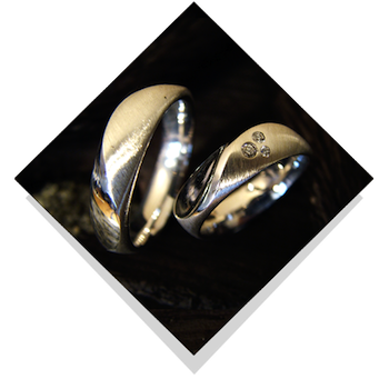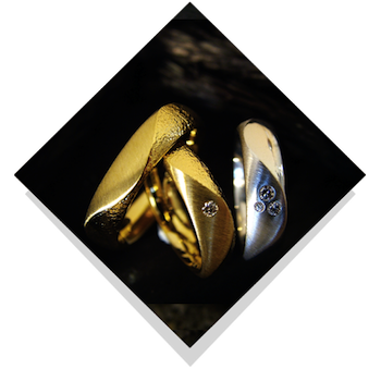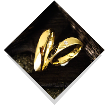 Matteret og hamret 14 karat guld, i dameringen én brillant, her en 0,03 ct. Faktisk er formen her lidt firkantet indeni - det er nemlig Jan Jørgensens quatroform som også kan fås i dette specielle design. |