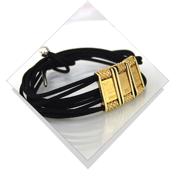 Her et nærbillede af guldbarre smykket, det er en ægte 24 karat guldbarre fra Schweiz du bærer om armen, i en en af verdens stærkeste liner - nemlig en faldskærmsline der også bruges af USAs militær. |