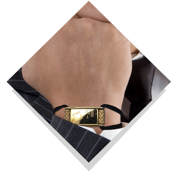 Herren på billedet er klar til fest eller møde, om armen har han et armbånd med 3 x 1 grams guldbarrer i forgyldte kassetter/rammer, monteret på sort faldskærmsline. |