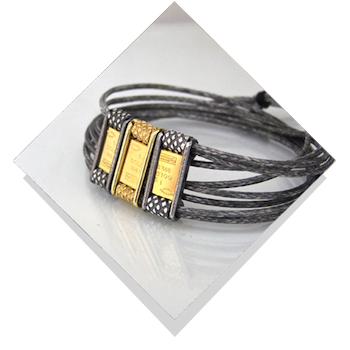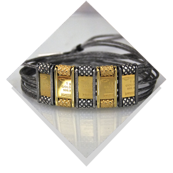 Guldbarre armbånd 3 x 1 gramHer et nærbillede af kite-line hvorpå der sidder 3 stk. 1 grams guldbarrer i henholdsvis oxyderede og forgyldte smykke-rammer. |