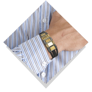 Armbåndet kan have mange udtryk, her med 5 guldbarrer, og da kassetterne er forskellige giver det et fint spil og liv i designet. |