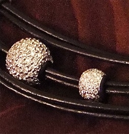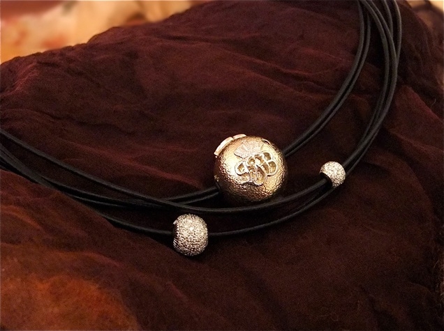 | Brillant kuglerne holdes på plads af en lille gummiring. Den stor ekugle har 91 små brillanter på samlet 1 carat. Det tog omkring 20 timer at sætte dem på. |