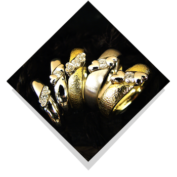 Her alle dameringene. Som vist er der to af ringene hvor også hjerterne er fyldt ud med brillanter ved siden af den midterste brillant. |