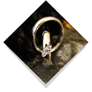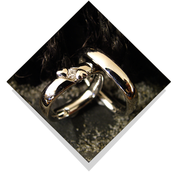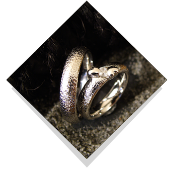 Her ser I det bredeste par ringe i serien.De er 6 mm og i dameringen sidder en brillant på 0,24 carat. Overfladen er hamret 14 karat guld og blankt hvidguld ved diamanten. |