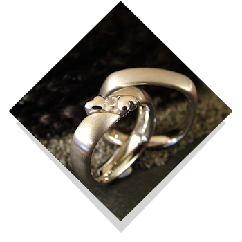 Vielsesringene: Royal Charm.Royal Charm ringene er charmerende kærlighedsringe med to assymetriske hjerter der på smukkeste vis omskranser brillanten i dameringen. En serie med kraftige ringe, der er behagelige og bløde at have på. Alle ringe er naturligvis i 14 karat guld og brillanten kan være i to kvaliteter, så der er noget for enhver smag og pengepung. |