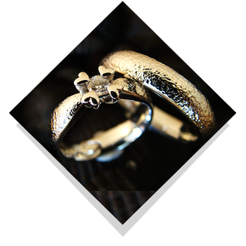 Her det smalleste par i serien, ringe i 4 mm bredde og med en 0,04 ct. brillant i dameingen. Hamrede 14 karat guldringe og hjertefatninger i 14 karat blankt hvidguld i kvindens ring. |