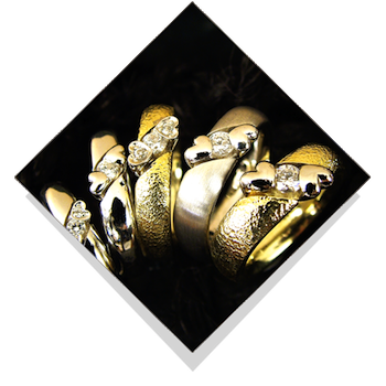 Hvidguldsfatning med hamret guld udenom, altid i 14 karat guld.
