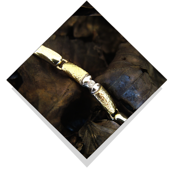 Armbåndet som er vist her har Royal Trend fatningen. Her en hvidguldsfatning og udenom et hamret guld led inden der kommer et led i blankt hvidguld på begge sider.