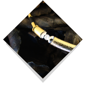 Her er vist et aflangt Royal Trend halssmykke, i hamret guld med fatning i hvidguld og monteret på kautjuk-kæde (gummi-art) her med yderligere guldeffekter.