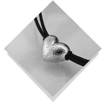 Kraftigt og hamret sølvhjerte, der her er sat på en sort stærk faldskærmsline. Fås også i guld og hvidguld. |