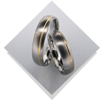 Et par ringe i matteret ædelstål og med en let og elegant 24 karat guldlinje assymetrisk placeret. Ringe der leder til tanker om stjerehimlen når den er skinner mod os på jorden.