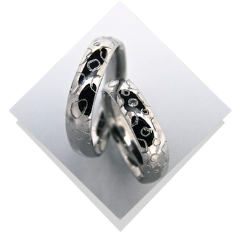 Også i dette par ædelstål ringe er der sjove overflader, små skyer eller bobler svæver rundt i ringene. |