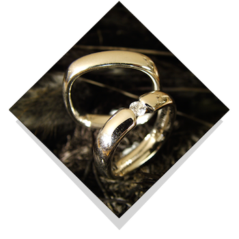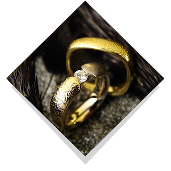 De viste ringe er de bredeste med en 0,24 ct. brillant i dameringen. Dameringene fås i størrelserne 0,04 ct. og op til 0,24 ct. Dameringen er i hamret 14 karat guld og matteret hvidguld, mens herreringen er i hamret guld.