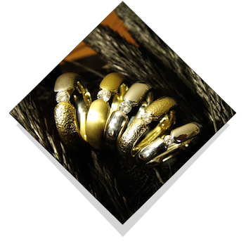 Her de forskellige bredder og guldfarver, former og overflader. Brillanterne vokser i takt med ringenes bredder så det forbliver i harmoni.