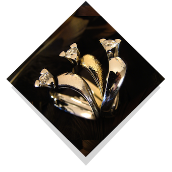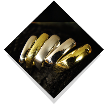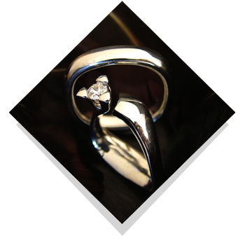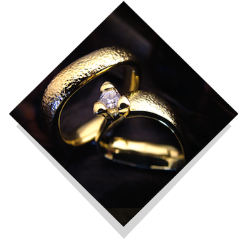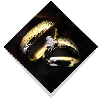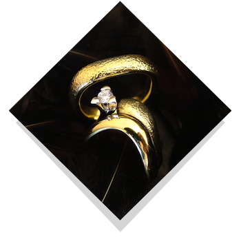 Hamret guld og hvidguldsside i dameringe, der hvor brillanten sidder. |
