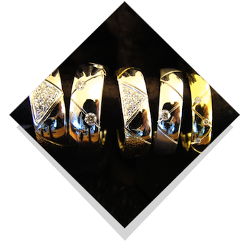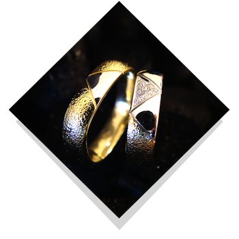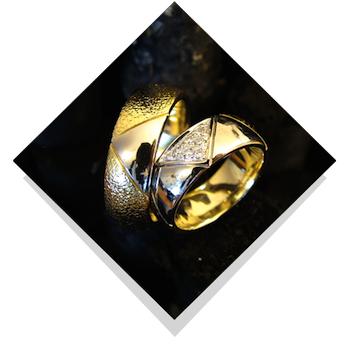 Her det bredeste par i serien, 7 mm ringe i en blanding af guld og hvidguld og med hele den trekantede flade fyldt med brillanter i dameringen. |