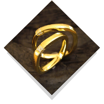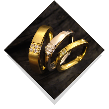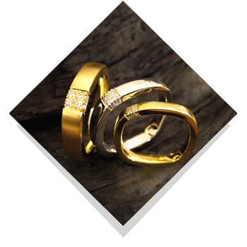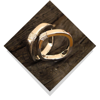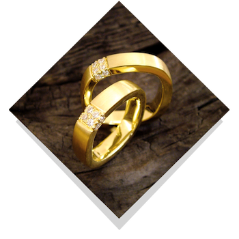 Vielsesringene: Romantic Touch.Disse nyfortolkede vielsesringe er markante både i deres form, en ergonomisk firkantet model, og ved at både dame- og herreringe indeholder diamanter. Jan Jørgensen synes at begge køn fortjener at bære den fantastik holdbare og smukke ædelsten som diamanten jo er. |