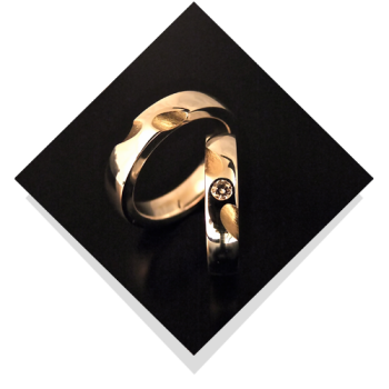 Her et andet sølvpar, hvor der er "udskårede" halve hjerter i hver af ringene.På den måde har kvinden et halvt hjerte og manden det andet halve hjerte, begge belagte med 24 karat guld. |