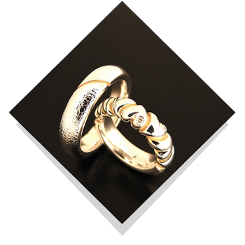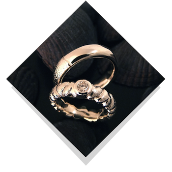 Her et par i en anden version. Kvindens ring har hjerter hele vejen rundt og de er skiftevis blanke og hamrede. På toppen af ringen sidder en stor brillant i rørfatning, den omsluttes nærmest af hjerterne. |