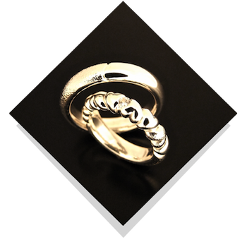 Vielsesringene: 2Souls 2Minds 2Spirits.Disse forlovelses- eller vielsesringe er i kraftigt sølv, belagt med 24 karat guld i de dybe markeringer, for at skabe kontrast. I dameringen er der isat brillanter. Til jer der holder af sølv og som også kan lide kærlighedssymbolet, hjertet, her bygget ind i dameringen på fineste vis. |